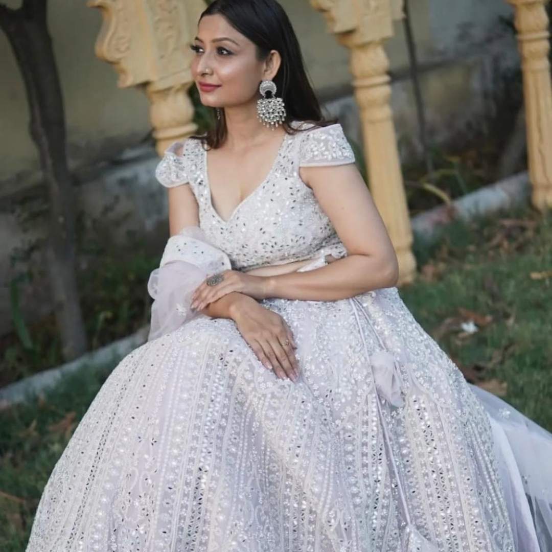 Shine naturally in lavender! The mirror work reflects beautifully under both daylight and artificial lights, making this top a favourite for fashion-forward pre-wedding captures.